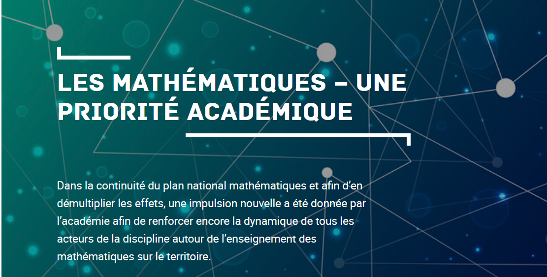 Dans la continuité du plan national mathématiques et afin d’en démultiplier les effets, une impulsion nouvelle a été donnée par l’académie afin de renforcer encore la dynamique de tous les acteurs de la discipline...